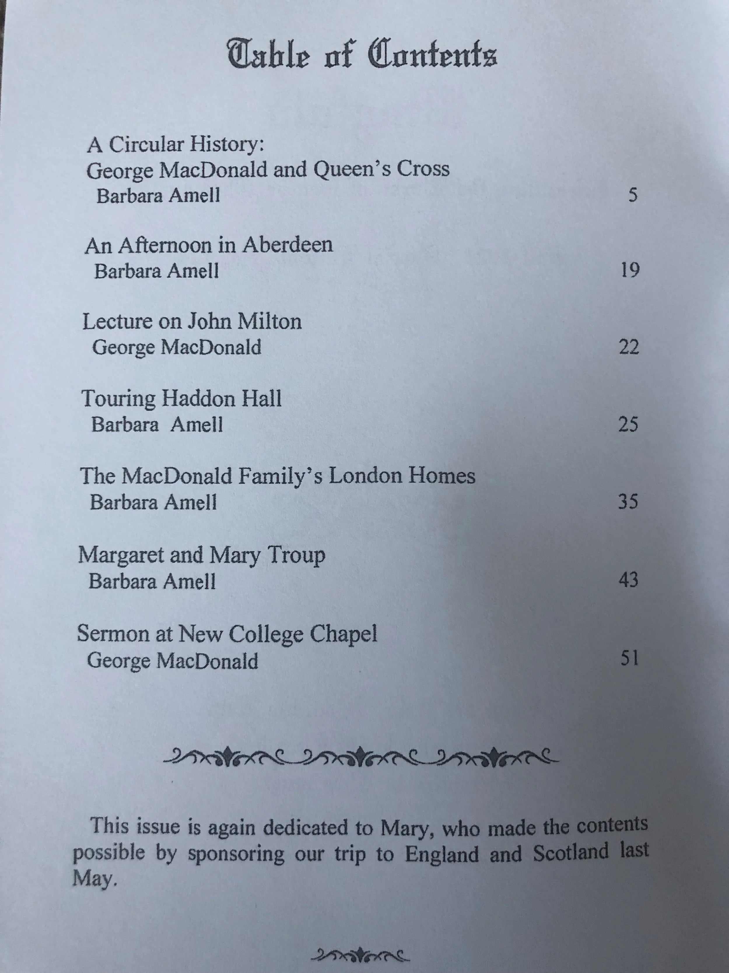 Some of these issues contain the first known reprints of short stories, articles and poems written by George MacDonald that had not been previously documented. Our complete tables of contents are listed at the Marion E. Wade Center's website and also featured on this website. For detailed information and availability regarding the back issues, please contact the editor, Barbara Amell, at b_amell@q.com